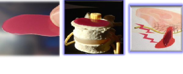Billeder af en "endeplade", vertebra med en ”endeplade” placeret korrekt ”oven på vertebra” og af en ”prolaps med et hyalinstykke” indvendigt.